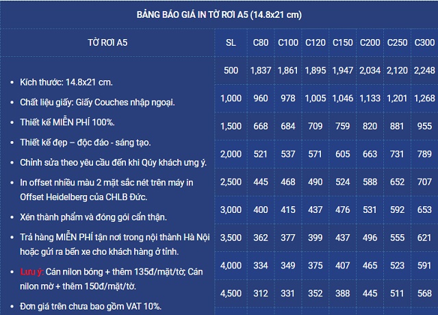 - Kích thước: một điều dễ hiểu, kích thước càng lớn chi phí in càng cao. Tuy in tờ rơi A5 đã có kích thước cố định là 14.8x21 cm nhưng có 1 số trường hợp khách yêu cầu tăng kích thước để phù hợp với lượng thông tin muốn truyền tải tới khách hàng, chúng tôi đều có thể đáp ứng