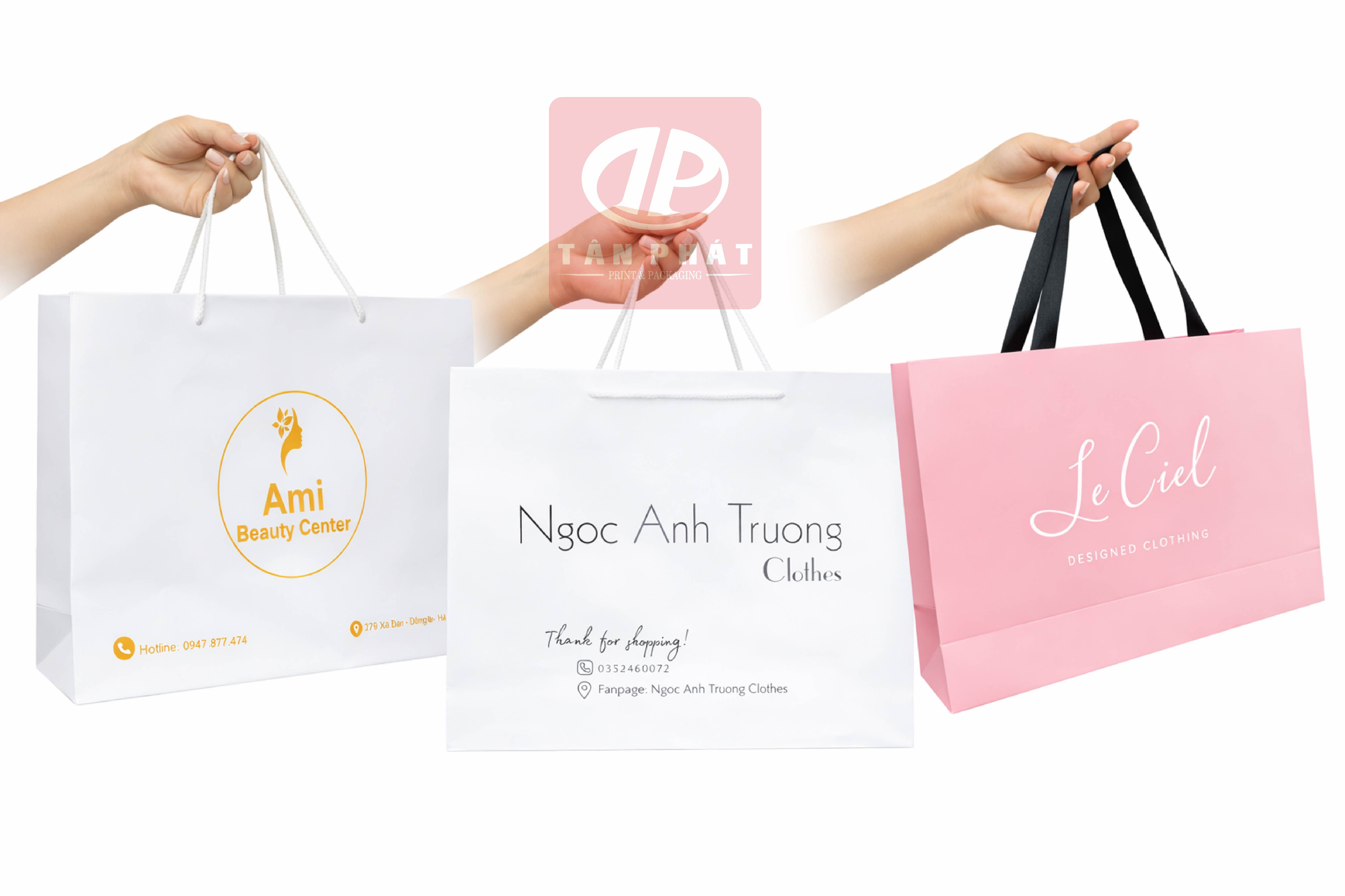 Ví dụ, một shop thời trang trẻ thường chuộng thiết kế tối giản, màu đen trắng hoặc tông pastel nhẹ, trong khi cửa hàng thời trang cao cấp lại thích túi giấy dày hơn, cán mờ, ép kim hoặc quai dù để tạo cảm giác sang. Với local brand, việc in logo rõ ràng và thiết kế nhận diện đồng bộ trên túi giấy là yếu tố rất quan trọng để tăng khả năng lan tỏa thương hiệu.