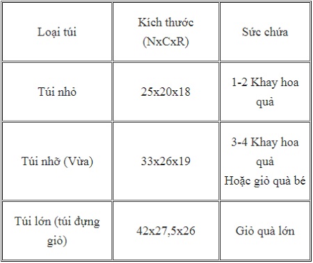 Đối với mặt hàng hoa quả, hiện nay chúng tôi phân ra 3 kích thước phổ biến nhất như sau: